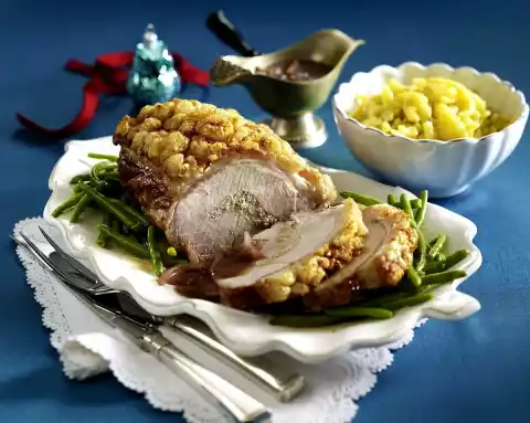 Turn the temperature up about 30 minutes before the end of the cooking time (electric oven: 200 °C/ circulating air: 175 °C/ gas: level 3). Brush the rind with salted water approx. 10 minutes before the end of the cooking time. Wash and clean the green beans and boil them in salted water for approx. 12 minutes.