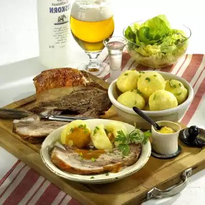Drizzle the oil on the oven pan. Place the roast on top. Roast in the preheated oven (electric cooker: 200 °C/ convection oven: 175 °C/ gas: level 3) for about 2 hours. Peel and halve 4 onions. Place the onions, bay leaf and juniper berries on the fat pan. After 30 minutes frying time, deglaze with approx. 1/4 litre of water. After about 1 hour, add another 3/8 litres of water. Meanwhile peel and wash 1 kg potatoes. Grate on a damp tea towel and squeeze well. Put the pressed potato water aside until the starch has settled (10-15 minutes). In the meantime cut the toast into small cubes. Heat butter in a pan, toast cubes while stirring. Peel the cooked potatoes and press them through a potato ricer. Add grated potatoes and settled starch (results in approx. 3 tablespoons; otherwise add cornflour to 3 tablespoons). Season with salt and work into a dough. Form approx. 10 dumplings. Fill some toast cubes into the middle of each dumpling.