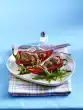 Dab the meat dry and season with salt and pepper. Spread liver sausage on the meat, roll it up and pin it. Clean, wash and cut leek into rings. Heat oil in a pan. Fry pork rolls in it for about 10 minutes at medium heat.