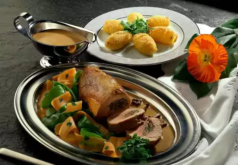 After 5 minutes add the carrots. Drain, toss in remaining fat, keep warm briefly. Wrap the meat in aluminium foil and let it rest for about 10 minutes. Pour mushroom water with remaining mushrooms into the pan, let it boil down a little.