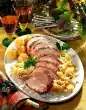 Stir in the sauce thickener, bring to the boil once. Season sauce with soup cubes, crème fraîche, salt, pepper and sugar. Remove wooden sticks from the meat. Cut fillet into slices. Serve with porcini sauce, vegetables and Swedish potatoes on a plate