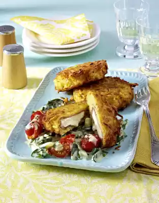 Drain the mozzarella and cut into 4 slices. Wrap a slice of ham around each piece. Peel, wash and coarsely grate the potatoes. Stir in eggs and flour. Season with salt and pepper. Heat the oil in a large coated pan over a low to medium heat. Form 4 Rösti with your hands out of half of the potato mixture, put some potato mixture in one hand, put a piece of wrapped cheese on each, cover with the rest of the potato mixture and press down carefully. Pour the potato mixture into the hot oil and fry over medium heat for 8-9 minutes, turning. Keep Rösti warm in the preheated oven (electric cooker: 150 °C/ convection oven: 125 °C/ gas: see manufacturer)