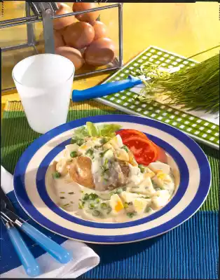 Add peas and refine with sour cream. Season to taste with salt and pepper. Cut the eggs into large cubes. Wash the chives and cut into fine rolls. Add eggs and chives to the sauce. Cut the potatoes, break them open and arrange them on a plate with the egg ragout.