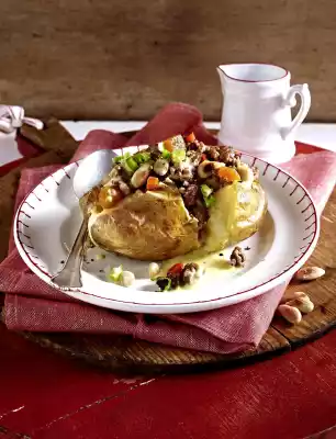 Take the potatoes out of the oven, carve them crosswise and break them open a little. Pour a little curry sauce into the potatoes, add the rest of the sauce and spread the mince mixture on top. Sprinkle with spring onions and serve immediately.