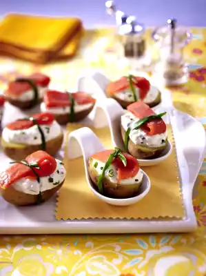 Wash the potatoes and cook in boiling salted water for about 20 minutes. Drain potatoes and rinse in cold water. Cut potatoes lengthwise in half and hollow them out. Finely chop the flesh