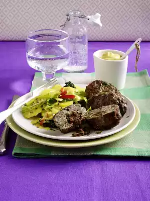 Wash the parsley, shake dry. Pluck the leaves and chop them. Peel and finely chop the onion. Knead minced meat, breadcrumbs, egg, 1 teaspoon mustard, diced onion and half of the parsley, season with salt and pepper. Form into 12 meatballs, fill with mushroom mixture