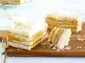 Place puff pastry slices on top of each other and roll out rectangularly (approx. 30 x 49 cm). Cut the puff pastry into 3 pieces (approx. 13 x 30 cm each) and prick several times with a fork. Place 2 puff pastry slices next to each other on a baking tray lined with baking paper and bake in a preheated oven (electric cooker: 200 °C/ convection oven: 175 °C/ gas: see manufacturer) for 20-25 minutes until golden brown. Remove the puff pastry bases from the oven and let them cool down. Bake the last puff pastry base in the same way