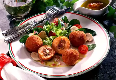 Roll the balls in breadcrumbs. Heat the frying fat and fry the rice croquettes in it until golden brown. Arrange salad and hot croquettes on plates. Drizzle with the vinaigrette and serve.