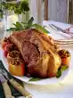 Bring to the boil. Mix 5 tablespoons of water and starch. Thicken sauce with it, bring to the boil again and season with salt, pepper and sugar. Arrange goose with apple slices and red cabbage on a plate. Garnish with marjoram.