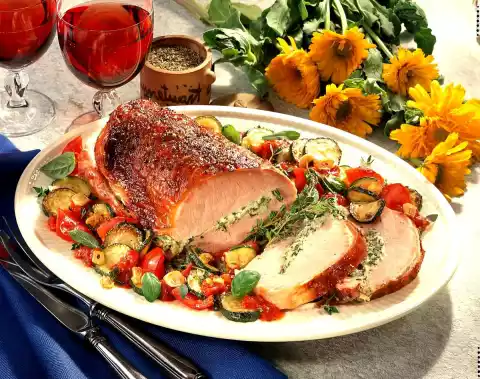Put the roast on a cold rinsed fat pan of the oven and cook in the preheated oven (electric cooker: 200 °C/ gas: level 3) for about 45 minutes. Clean and wash the zucchini and tomatoes. Slice the zucchini and cut the tomatoes into pieces. Fry zucchini in hot oil for about 3 minutes. Add tomatoes and tomato pieces with onion and garlic and heat up. Season vegetables with salt and pepper. Arrange the roast on the vegetables