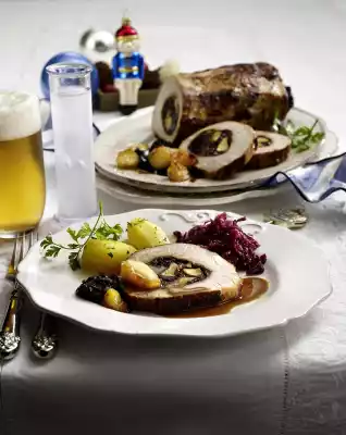 Bake in the preheated oven (electric cooker: 200 °C/ circulating air: 175 °C/ gas: level 3) for about 15 minutes. Pour the braising stock through a sieve into a pot. Add port wine. Bring everything to the boil and let it boil down at high heat for about 5 minutes. Add cream, bring to the boil again. Season sauce with salt and pepper. Serve everything. Serve with parsley potatoes and a spiced red cabbage