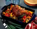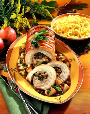 Wrap with kitchen string and place on the fat pan of the oven. Bake in the preheated oven (electric cooker: 200 °C/ gas: level 3) for about 1 3/4 hours. In the meantime, wash and quarter apples and remove the core.