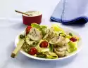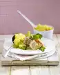 Deglaze with stock and white wine. Cover and cook in the preheated oven (electric cooker: 200 °C/ gas: level 3) for about 35 minutes. In the meantime, wash and slice the lemon. Cut remaining onion into rings. For the puree boil 1/4 litre of water. Remove the pan from the heat and stir in the puree flakes. Fry onion rings and lemon slices in hot oil. Put the roaster on the stove. Stir in sauce thickener and cream, season sauce again. Cut roulade into slices. Arrange meat slices, potatoes, mashed potatoes, onion rings and lemon slices on plates, garnished with parsley and rosemary.