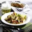 Remove the pan from the heat and stir in the puree flakes. Fry onion rings and lemon slices in hot oil. Put the roaster on the stove. Stir in sauce thickener and cream, season sauce again. Cut roulade into slices. Arrange meat slices, potatoes, mashed potatoes, onion rings and lemon slices on plates, garnished with parsley and rosemary.