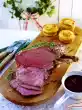 Spread the roast with 2 tablespoons of jelly, spread the cranberry-nut mixture on top and press on a little. Add sauce and meatballs.