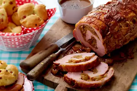 Remove the roast from the fat pan and keep warm. Pour the braising stock through a sieve into a pot and bring to the boil. Mix flour and 4 tbsp. water until smooth, stir into the stock, bring to the boil and simmer for approx. 3 minutes. Season to taste with Worcester sauce, salt and pepper. Arrange roast. Bacon rolls taste good with it.