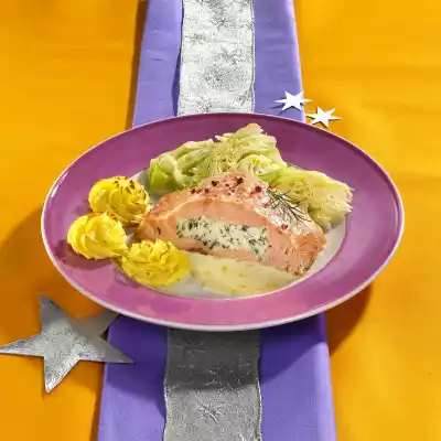 Cut a pocket in the salmon. Fill the salmon with fish farce. Season fish with salt and pepper. Put the salmon in a greased casserole dish, brush with oil. Bake in the preheated oven (electric cooker 200 °C/ convection oven: 175 °C/ gas: level 3) for about 20 minutes.