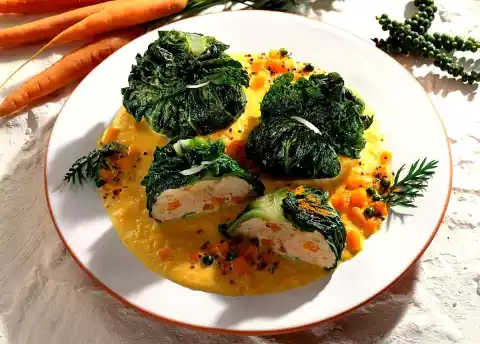 Season with salt and pepper. Form balls from the dough, depending on the size of the cabbage leaf, wrap in 1 or 2 savoy cabbage leaves and bind. Heat up salted water. Cover the savoy cabbage bags and let them simmer for about 15 minutes. In the meantime cut the carrots into large pieces. Cook in 200 ml boiling salted water for about 12 minutes. Then puree. Add cream, peppercorns and remaining carrot cubes and bring to the boil. Stir in sauce thickener.