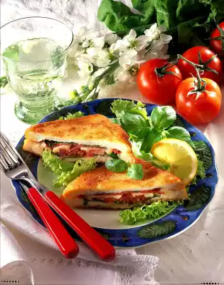 Heat the oil in a large coated pan and fry the bread in it. Clean and wash the salad. Put the salad leaves on the plates. Cut filled loaves of bread diagonally in half and arrange them on top. Serve garnished with basil and lemon.