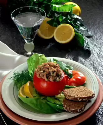 Pour the marinade over the salad. Place the stuffed tomato on the lettuce leaves. Garnish with dill and lemon wedges. Serve with wholemeal bread.
