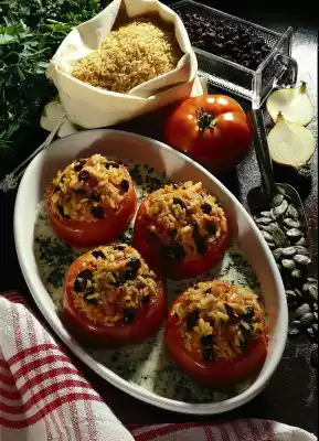 Hollow out the tomatoes with a spoon. Cut the tomato lid and the meat into small pieces. Wash and drain currants and pumpkin seeds. Add tomato pieces, currants and pumpkin seeds to the rice 10 minutes before the end of cooking time.
