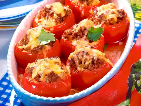 Clean and wash the tomatoes, cut off a lid and hollow out the tomatoes. Put them in an ovenproof dish. Bring 1/2 litre of water to the boil, stir in vegetable stock, tomato interior and tomato paste. Fill tomatoes with minced meat and add stock. Grate cheese over the stuffed tomatoes. Bake in the preheated oven (electric cooker 200 ° C/ gas: level 3) for about 20 minutes. Serve garnished with some parsley as desired