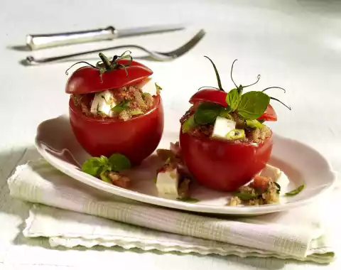 Cut 4 leaves into strips. Let the amaranth cool down lukewarm. Mix cheese, oil, tomato pulp, mint strips, spring onion and amaranth and season to taste with salt, pepper and vinegar. Season tomatoes from the inside with salt and pepper and add the amaranth mixture. Put the lid on and garnish with mint
