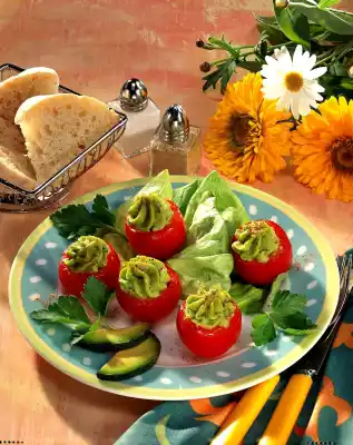 Pour the avocado cream into a piping bag with a star-shaped spout and squirt it into the tomatoes or fill it in with a teaspoon. Arrange the tomatoes on the lettuce leaves and sprinkle with some cayenne pepper. Serve with white bread as desired