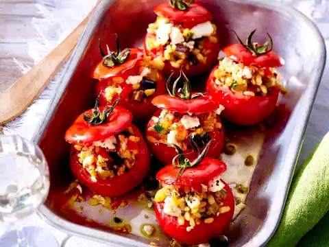 Place the tomatoes in a casserole dish and fill with vegetable-egg mixture. Put the tomato lid on and sprinkle with 2-3 tbsp. oil. Bake in a preheated oven (electric cooker: 200 °C/ convection oven: 175 °C/ gas: see manufacturer) for approx. 25 minutes.