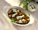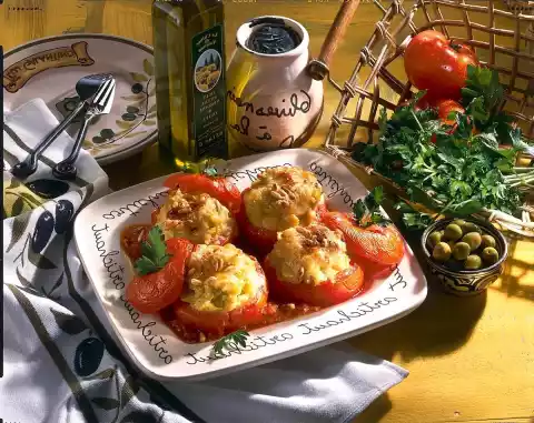 Washing tomatoes, cleaning. Cut off one lid each. Remove the flesh and dice. Peel and chop the onion. Garlic peel, crush