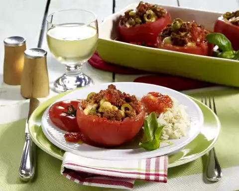 Fill the hollowed out tomatoes with the chopped mass and place them in the mould. Place the tomato lid on top or on top of the mould. Cook in the preheated oven (electric cooker: 200 °C/ convection oven: 175 °C/ gas: level 3) for 15-20 minutes.