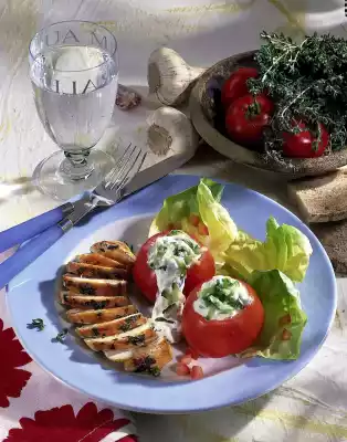 Fill tomatoes with tzatziki. Cut the chicken filet into slices and arrange on a plate together with the stuffed tomatoes. Sprinkle with tomato cubes and serve garnished with lettuce leaves as desired.