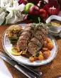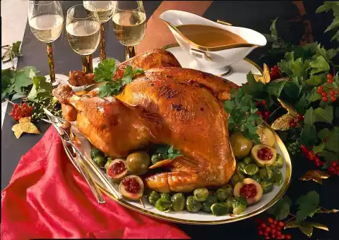 Turn the turkey after about 1 hour and pour on 1/4 litre of chicken soup. Top the turkey with roast stock from time to time. Wash the pears, spread them around the turkey 30-40 minutes before the end of the roasting time and cook them together with the turkey.