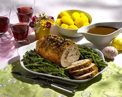 Wash the meat, dab dry and spread out on the worktop. Spread the filling evenly over the meat. Roll up the meat from the long side. Fix with wooden skewers. Season with salt and pepper.
