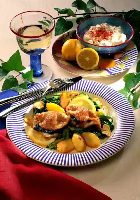 After 5 minutes add chopped onion, mushrooms and schnitzel (turn schnitzel several times). Finally, let the remaining spinach collapse in the frying fat. Mix everything loosely and season to taste with salt, pepper and lemon juice.