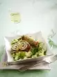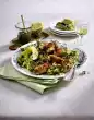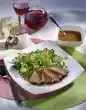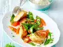 Add 5 tablespoons of water. Season spring onions with salt and pepper and continue cooking for about 3 minutes. Take out the meat and cover and keep warm. Pour chicken stock and cream into the pan, bring to the boil and thicken with sauce thickener.