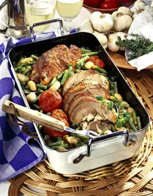 Deglaze with broth. Cover and braise in a preheated oven (electric cooker: 200 °C/ convection oven: 175 °C/ gas: level 3) for 30 minutes. In the meantime, rinse and drain the beans. Clean and wash the tomatoes. Add the green beans, bean seeds and tomatoes to the casserole. Season with salt and pepper, add 200 ml water and braise for 10 minutes in the open roasting pan. Deglaze again with 300 ml water and finish cooking for about 20 minutes. Serve garnished with fresh herbs