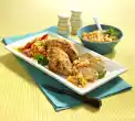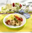 Add cream to the sauce, sprinkle in the sauce thickener while stirring and bring to the boil. Season to taste with salt and pepper. Drain the pasta. Arrange medallions, noodles and creamed vegetables on a plate. Garnish with parsley.