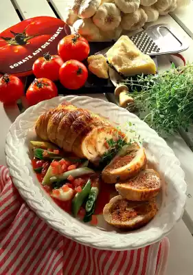 Season to taste with salt, pepper and paprika. Cut the roulade open and serve with vegetables in the sauce. Sprinkle with tomato cubes and garnish with thyme.