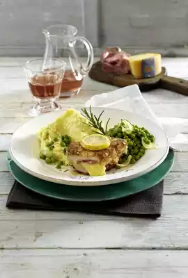 Heat the lard in a pan and fry the escalopes for about 10 minutes while turning. Peel onions and cut into slices. Heat 2 tbsp. butter in a pan and fry the onion slices briefly. Add peas and 4 tbsp. water, bring to the boil and cook for about 5 minutes. Season to taste with salt and sugar. Wash lemon hot, grate dry and cut off 4 slices. Turn lemon slices briefly in the schnitzel fat. Arrange on plates and garnish with rosemary