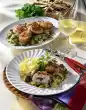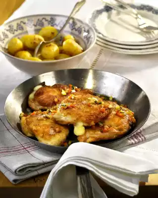 Heat 3 tablespoons of oil in a coated frying pan. Fry the escalopes on each side for 5-7 minutes on medium heat until golden brown. Fry the remaining vegetable cubes briefly. Arrange everything. Serve with roast potatoes or chips and salad