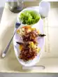 Rinse cutlets, dab dry and beat very flat. Cover 1 cutlet half each with 1 tbsp. vegetables and 1 slice of cheese. Fold the other half over it and pin it down