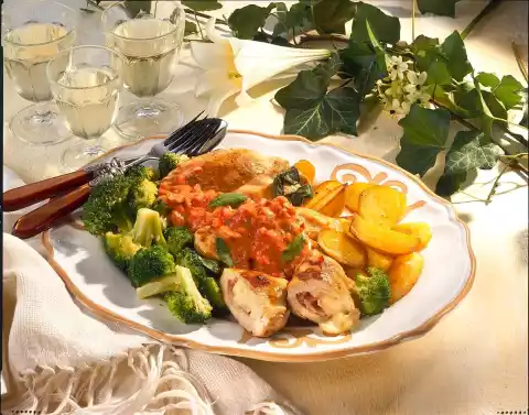 Cook broccoli in boiling water for about 12 minutes. Heat 1 tablespoon of oil in a pot, fry onion, garlic and sage in it, stir in tomato paste and add tomatoes and cream and mix. Season to taste with salt, pepper, paprika and sugar. Let the sauce boil down for about 4 minutes at medium heat, keep warm. In the meantime heat 1 tablespoon of oil in a pan and fry the potatoes in it while turning. Then season with salt and pepper. Heat the rest of the oil in a pan and fry the stuffed escalopes in it at medium heat on each side for about 4 minutes. Then season with salt and pepper. Clean, wash, quarter, seed and finely dice the tomato. Arrange potatoes, vegetables, meat and sauce on a plate. Serve garnished with sage
