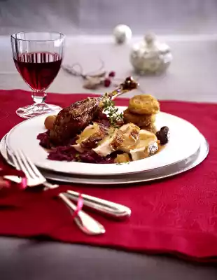 Lift the turkey off the baking tray, keep warm. Pour roast stock through a sieve, collect in a pot and drain well. Degrease the stock and bring to the boil. Stir starch and 5 tbsp. water until smooth. Bind the stock with it, bring to the boil again and simmer for about 1 minute. Keep warm. Take turkey out of the oven and cut into pieces. Remove the filling carefully. Arrange red cabbage, potato thaler, turkey with some sauce and filling on plates. Garnish with thyme. Add remaining sauce and filling