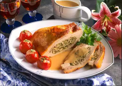 Wash the meat and dab dry. Fill the meat mixture into the meat pocket. Plug the opening with wooden sticks and wrap kitchen string around it. Rub meat with oil, season with salt and pepper and place on the fat pan of the oven.
