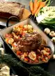 Roast in the preheated oven (electric cooker: 200 °C/ gas: level 3) for about 1 1/4 hour. Wash the carrot and peel the onion. Cut both into large pieces and put them on the fat pan. Gradually pour 1/2 litre of water over them.