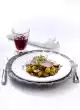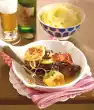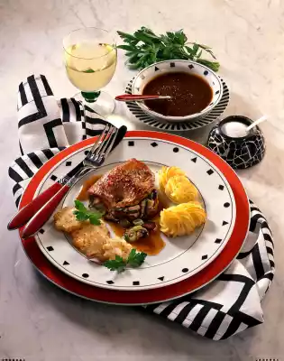 Put schnitzel in the hot sauce. Heat the remaining fat in a pan and fry the celery slices until golden brown. Season with salt and pepper. Arrange schnitzel with sauce, celery flowers and duchess potatoes.