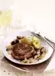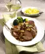 Remove, keep warm. Deglaze gravy with stock and Noilly Prat and bring to the boil. Stir cornflour in a little water until smooth and thicken the sauce. Bring to the boil again and season with salt and pepper.