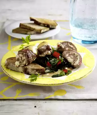 Heat 1 tablespoon of oil in a frying pan. Fry the rolls in it for 4-5 minutes. Cover the rolls and fry them for about 8 minutes, take them out and keep them warm. Add 250 ml broth and milk, bring to the boil, thicken with sauce thickener, stir in mustard, season to taste with salt, pepper and a little sugar. Arrange rolls, spinach vegetables and sauce on plates. Garnish with parsley. Roasted brown bread tastes good with it