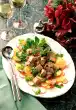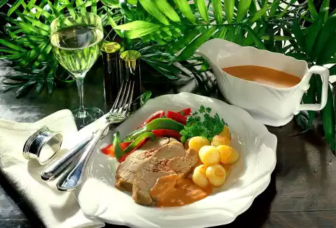 In the meantime, gradually pour on approx. 1/8 litre of water. From time to time pour the meat with roast stock. Peel and wash the potatoes and cut out small balls with a potato cutter. Cook in boiling salted water for about 10 minutes.